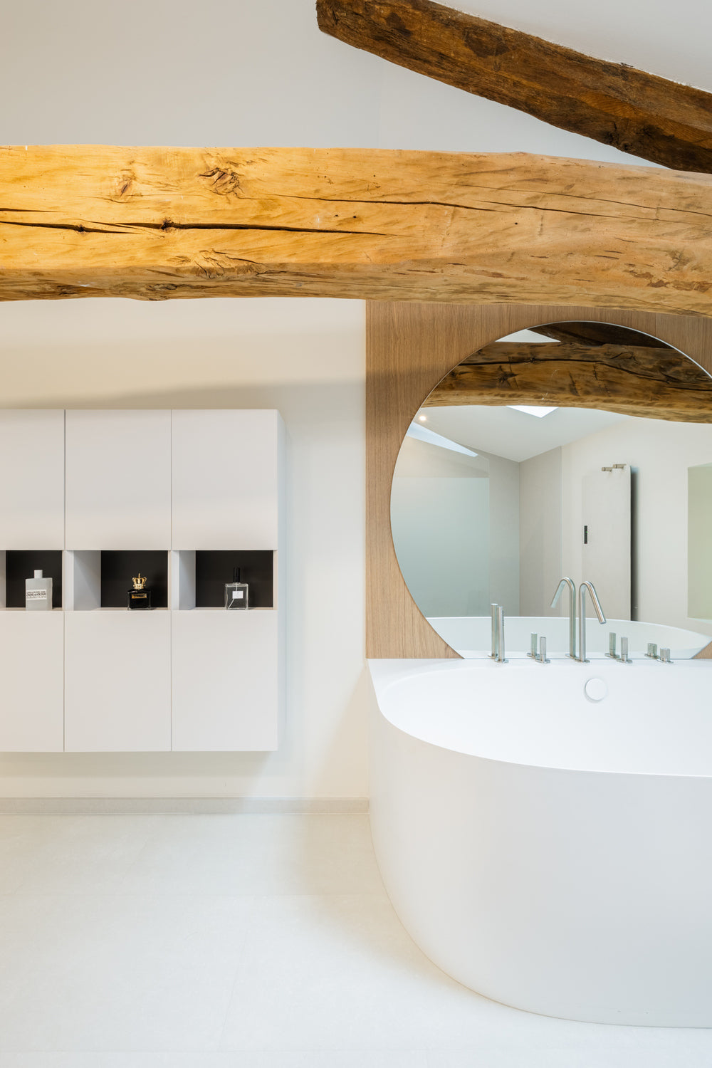 Les poutres anciennes dialoguent avec des lignes contemporaines, tandis que le Silestone Nolita structure l’ensemble avec douceur et continuité : vasque sur mesure, receveur, dallage mural et paroi de douche composent un projet cohérent, épuré et intemporel.