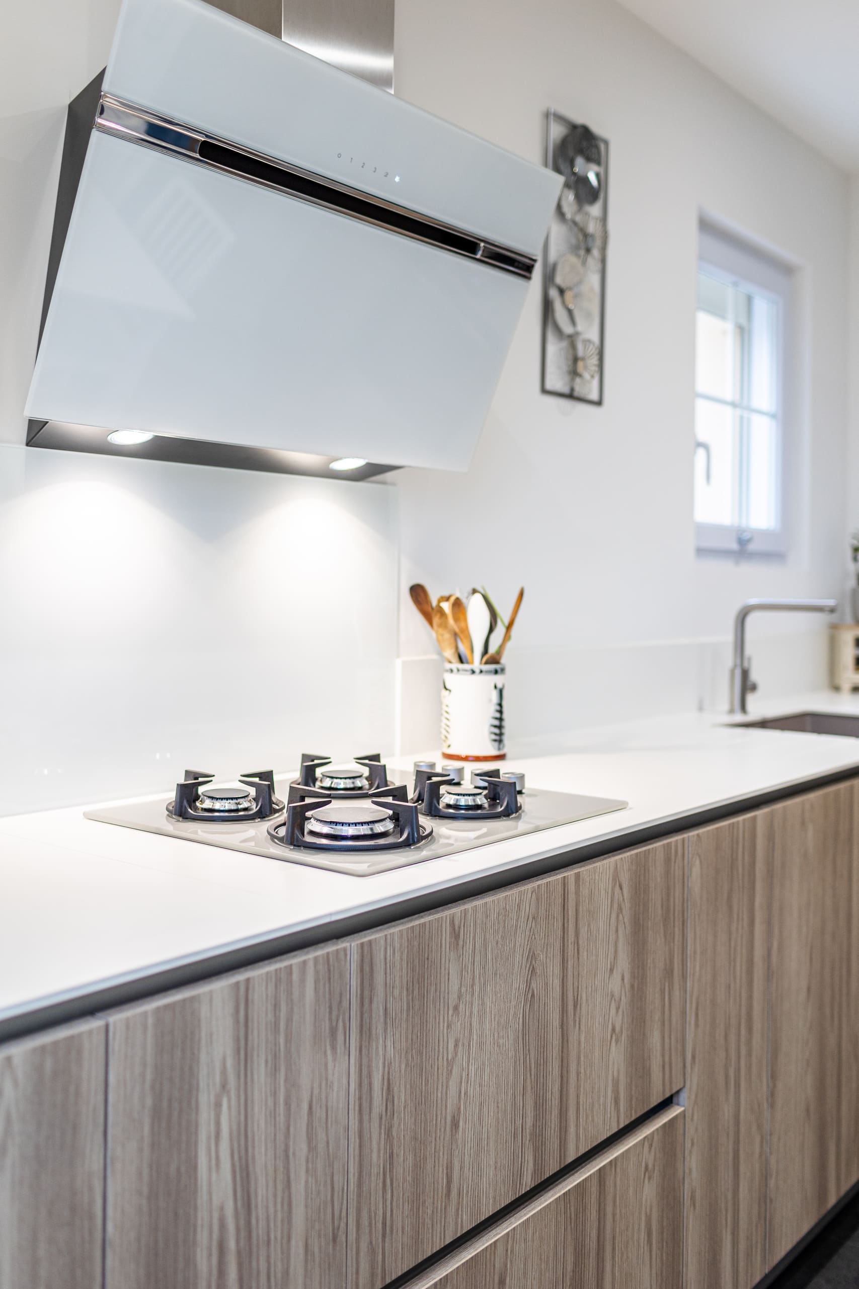 Avec ses façades en bois naturel, qui apportent une chaleur et une authenticité à l'espace, cette cuisine associe style et fonctionnalité. Les plans de travail en compact blanc offrent quant à eux une surface de travail solide et facile à entretenir, parfaite pour les tâches culinaires les plus exigeantes. Vous remarquerez la disposition astucieuse de cette cuisine, qui maximise l'espace disponible tout en créant un environnement confortable et accueillant. Les appareils électroménagers sont judicieusement placés pour faciliter la préparation des repas et la cuisson, tandis que l'éclairage doux et chaleureux met en valeur la beauté naturelle des matériaux utilisés.