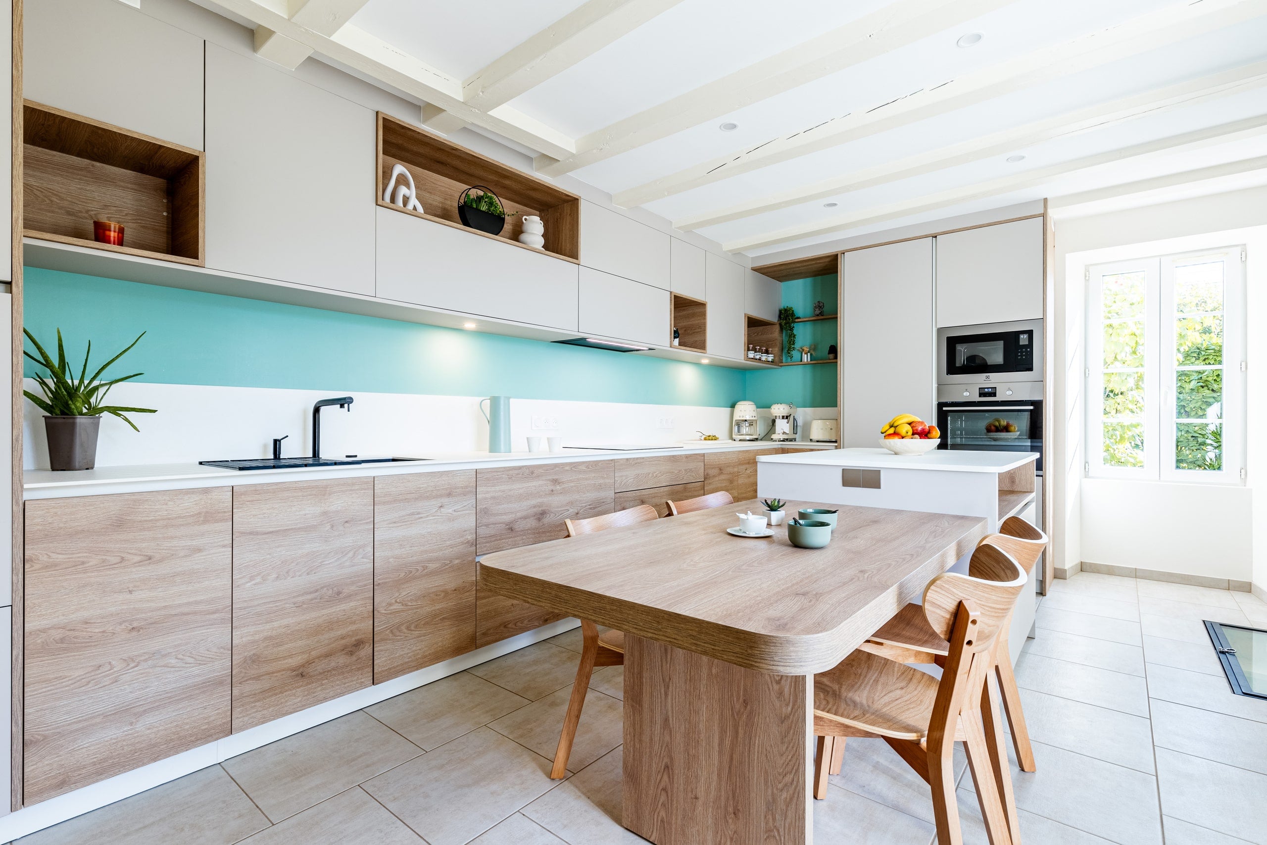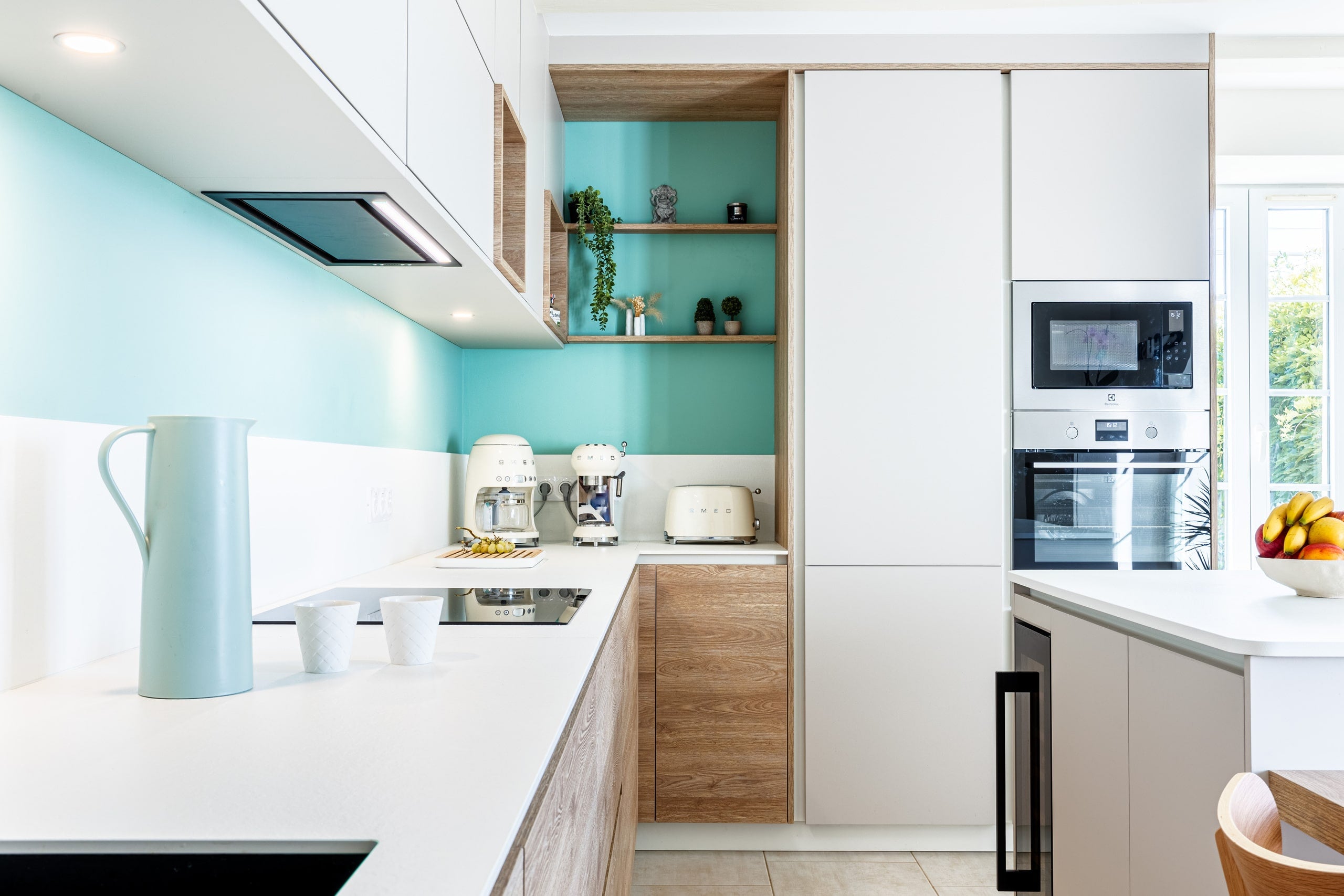 Nos clients ont alors décidé d'apporter une couleur pop “vert d'eau” sur le mur pour venir réveiller l'ensemble avec une touche de fraîcheur.
