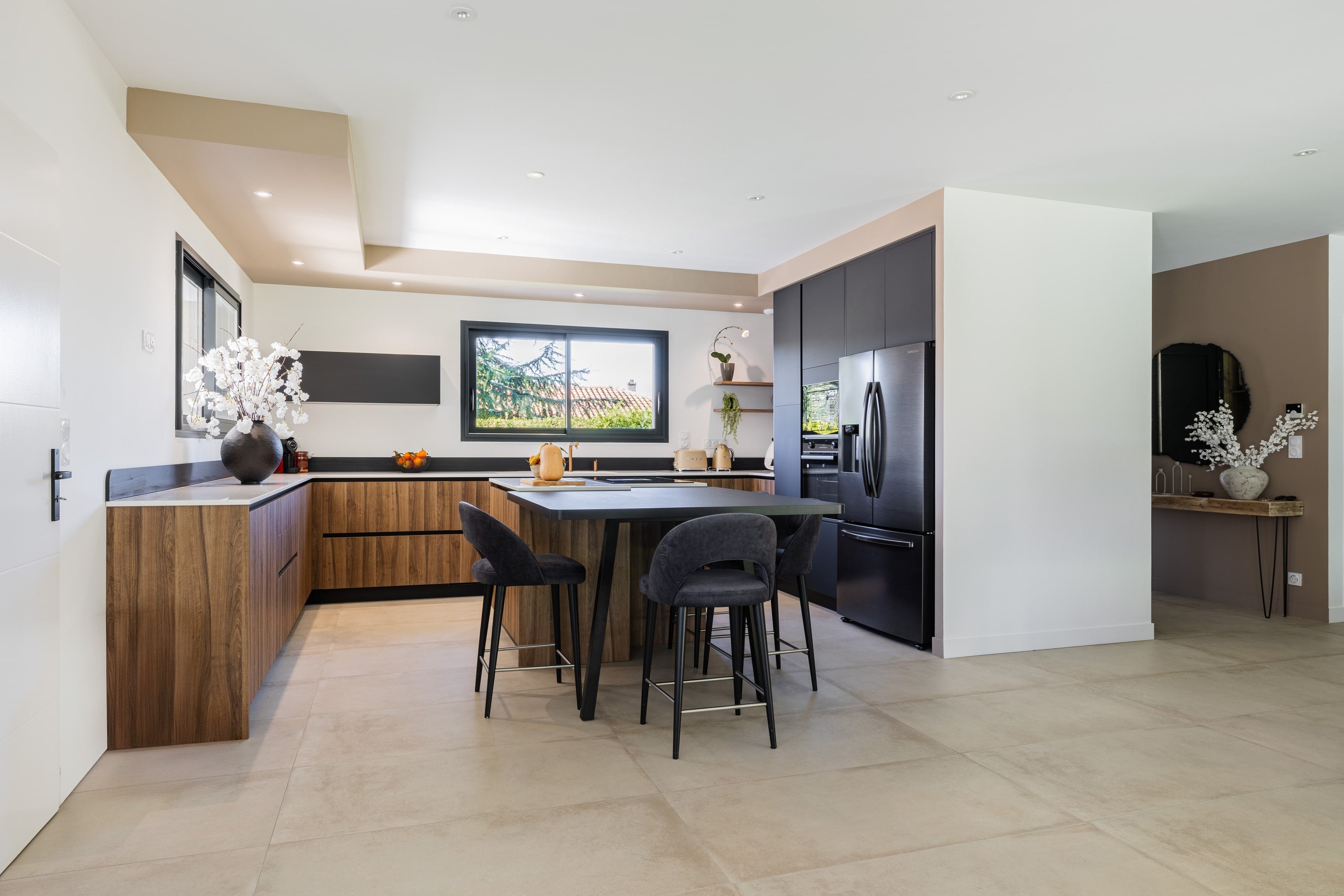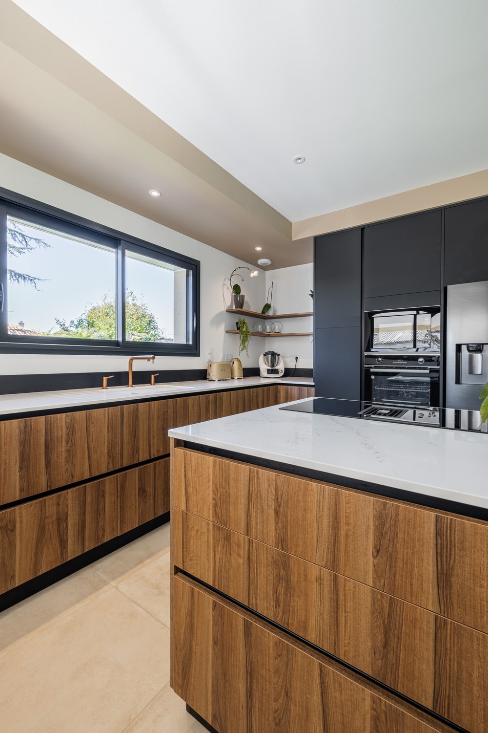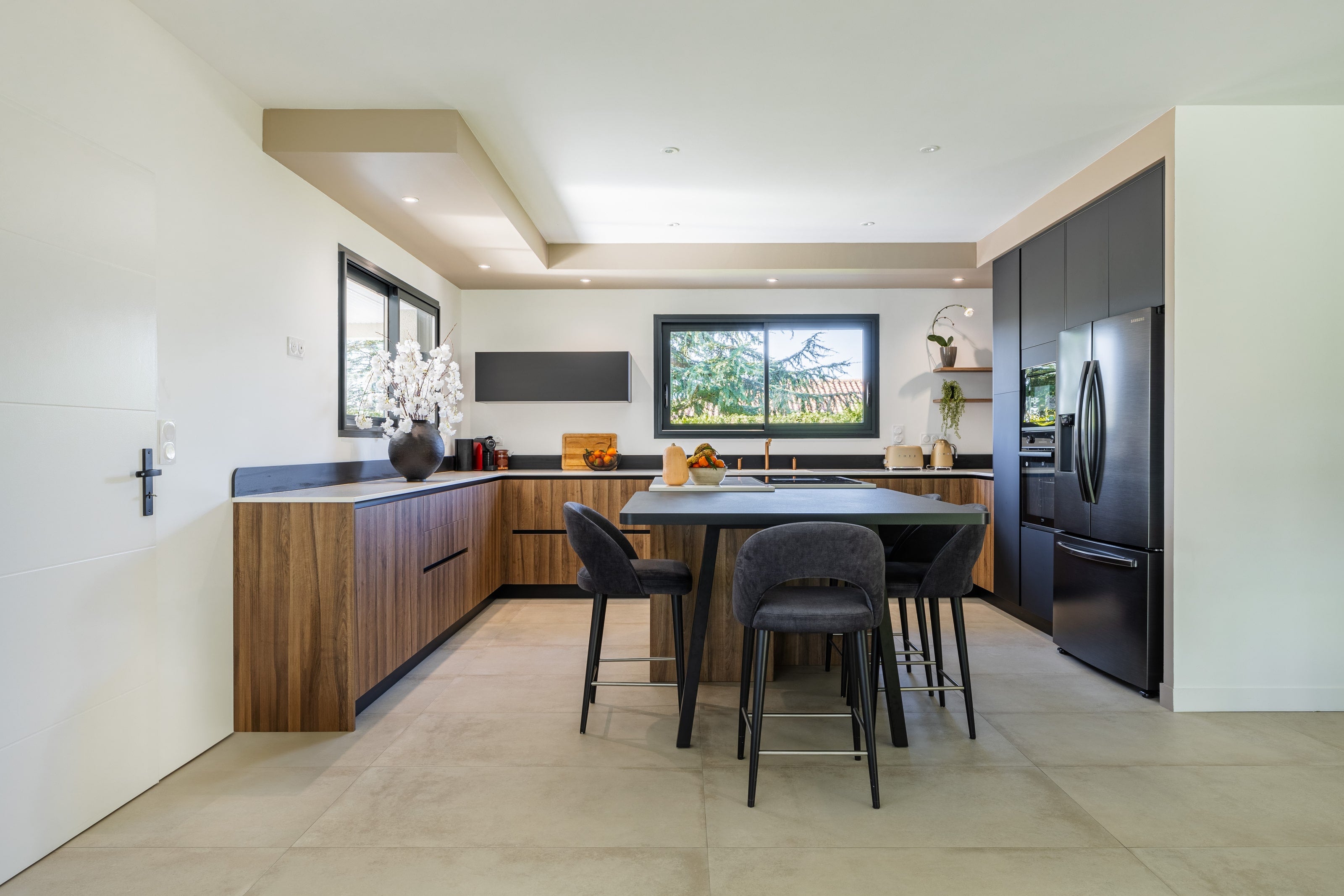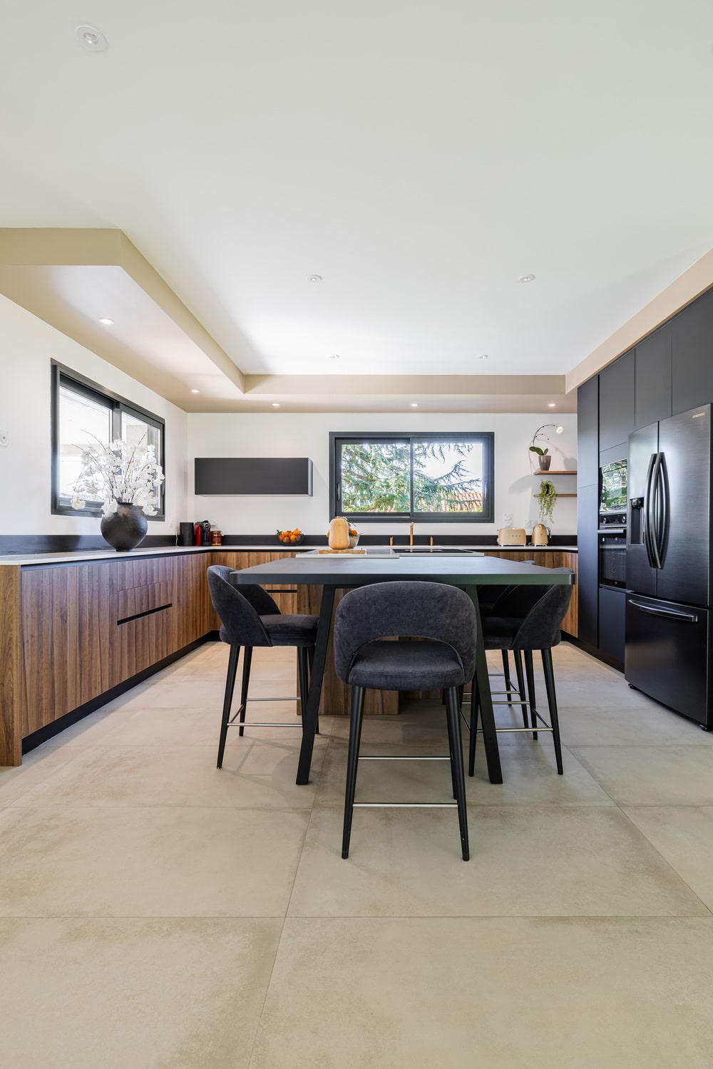 Une cuisine contemporaine entre noyer foncé et noir mat
