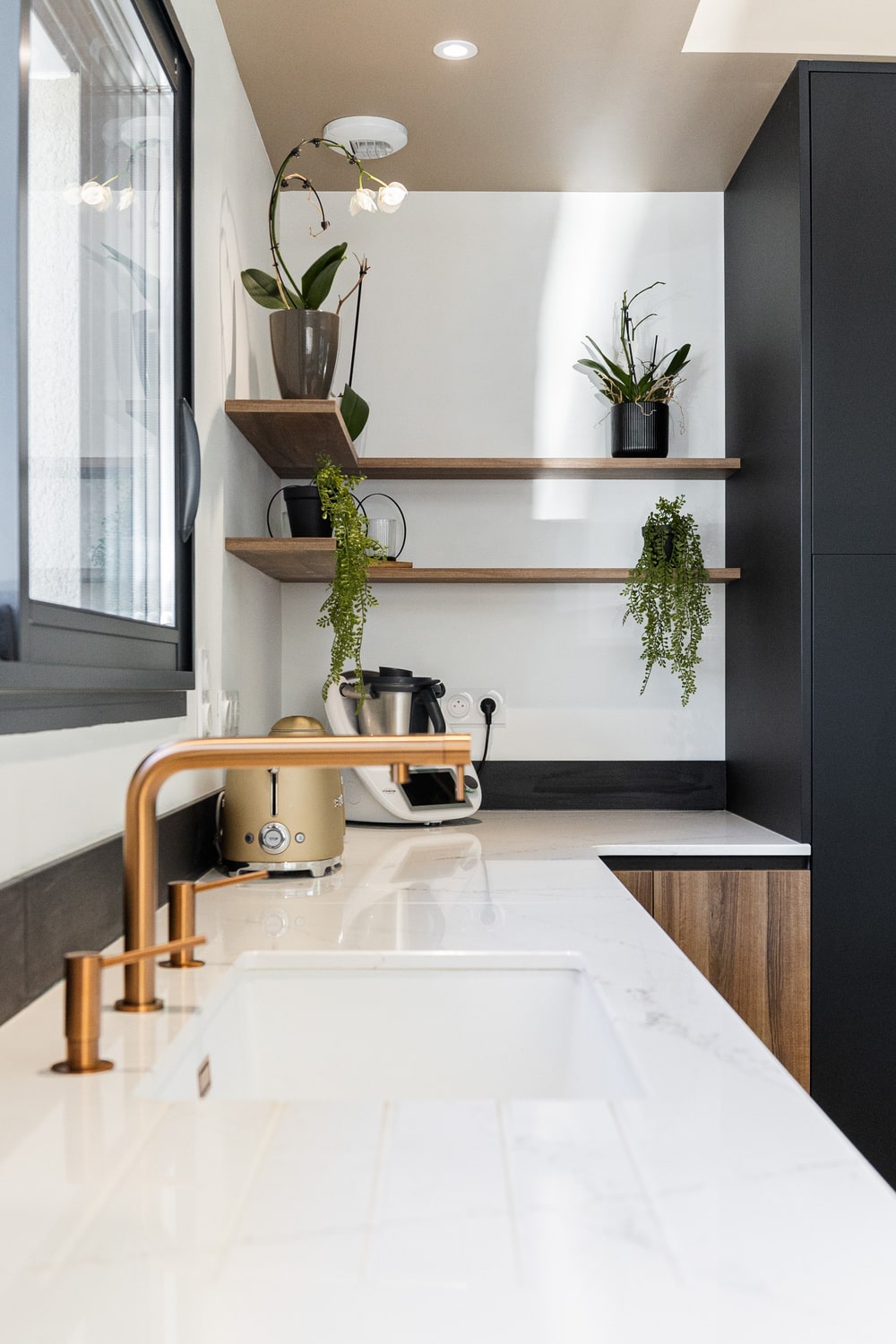 Le jeu des volumes révèle une composition subtile : façades bois RHO en ton clair, colonnes KAPPA en noir mat pour structurer l’ensemble, et un plan de travail en Silestone Ethereal Glow qui capte la lumière avec délicatesse. Ses veines dorées apportent une vibration minérale à l’espace, en résonance avec les détails cuivrés de la robinetterie.