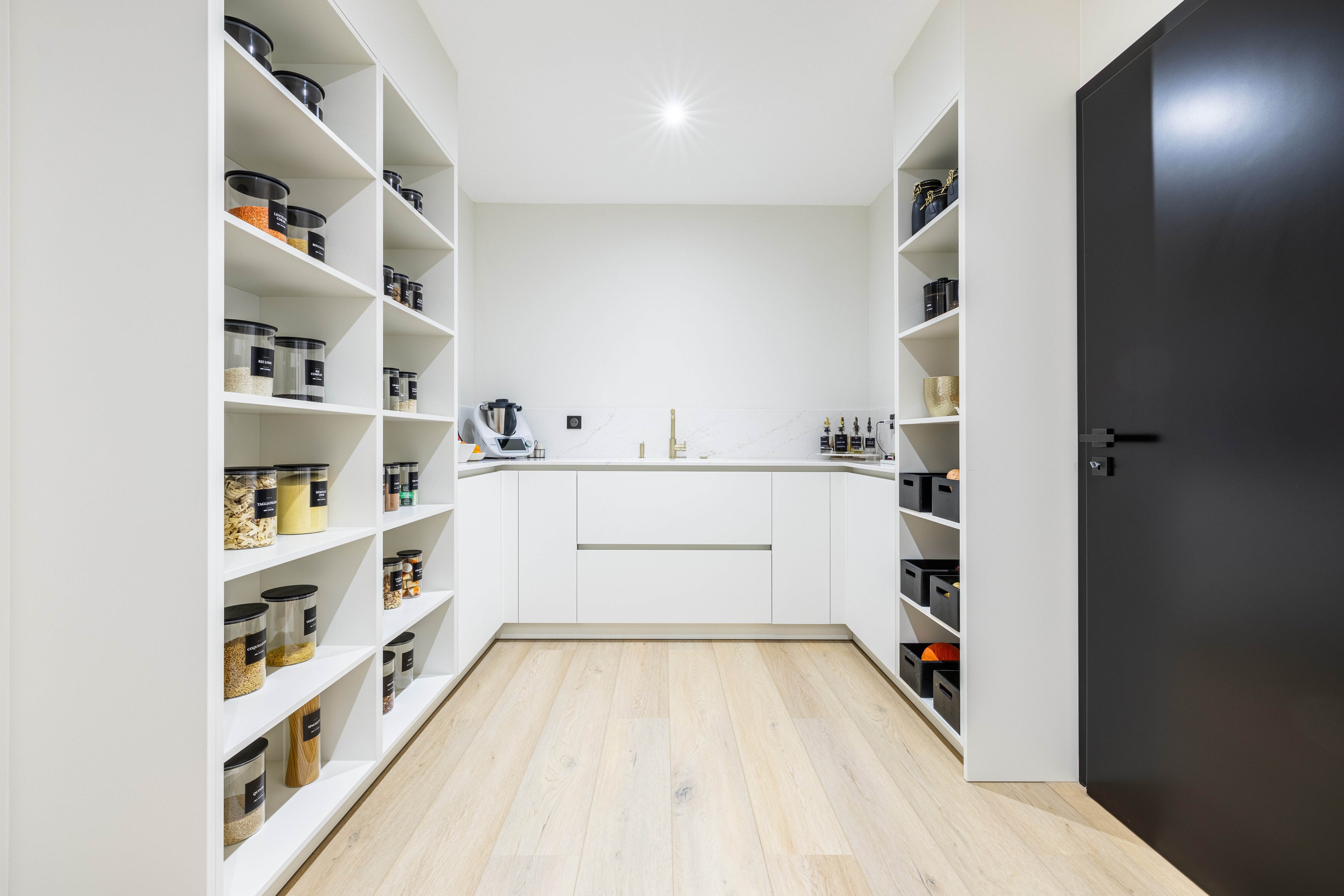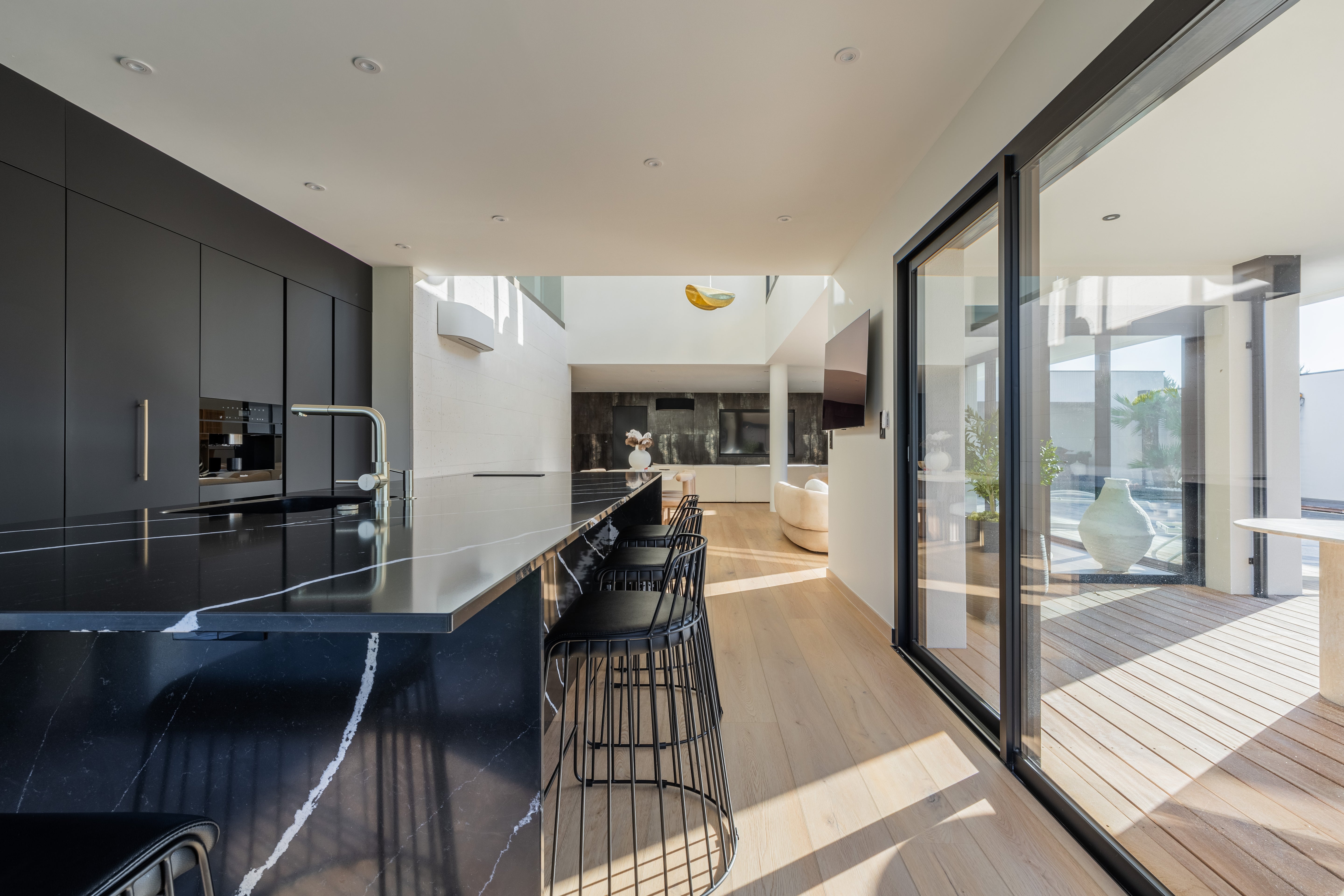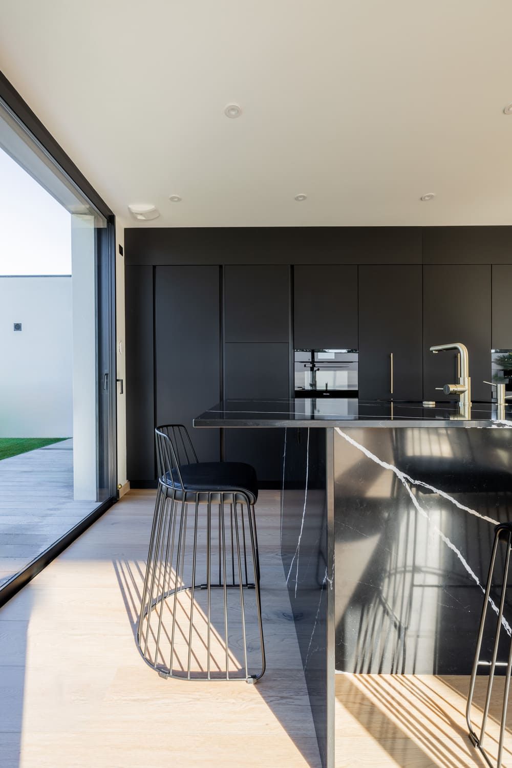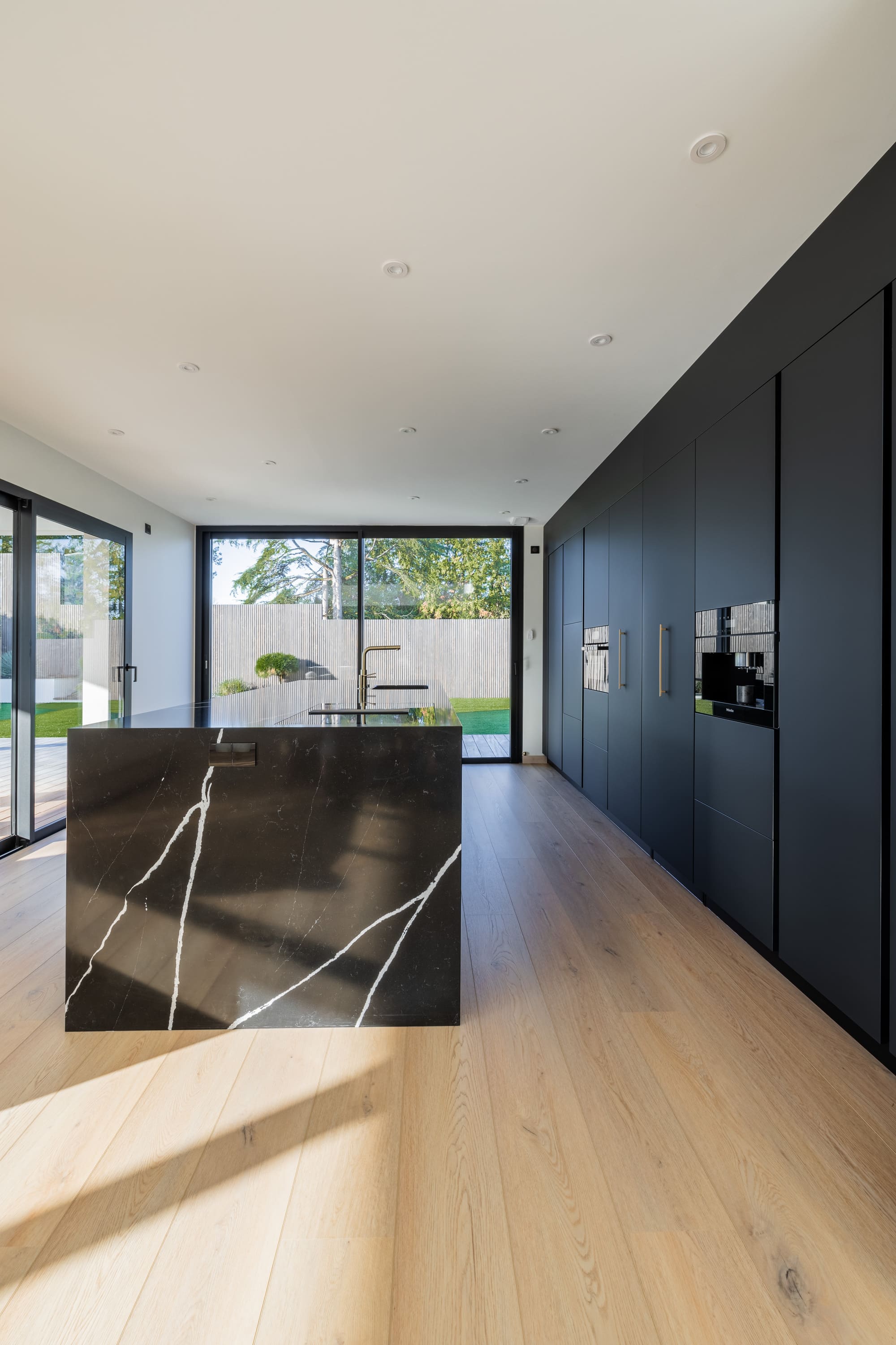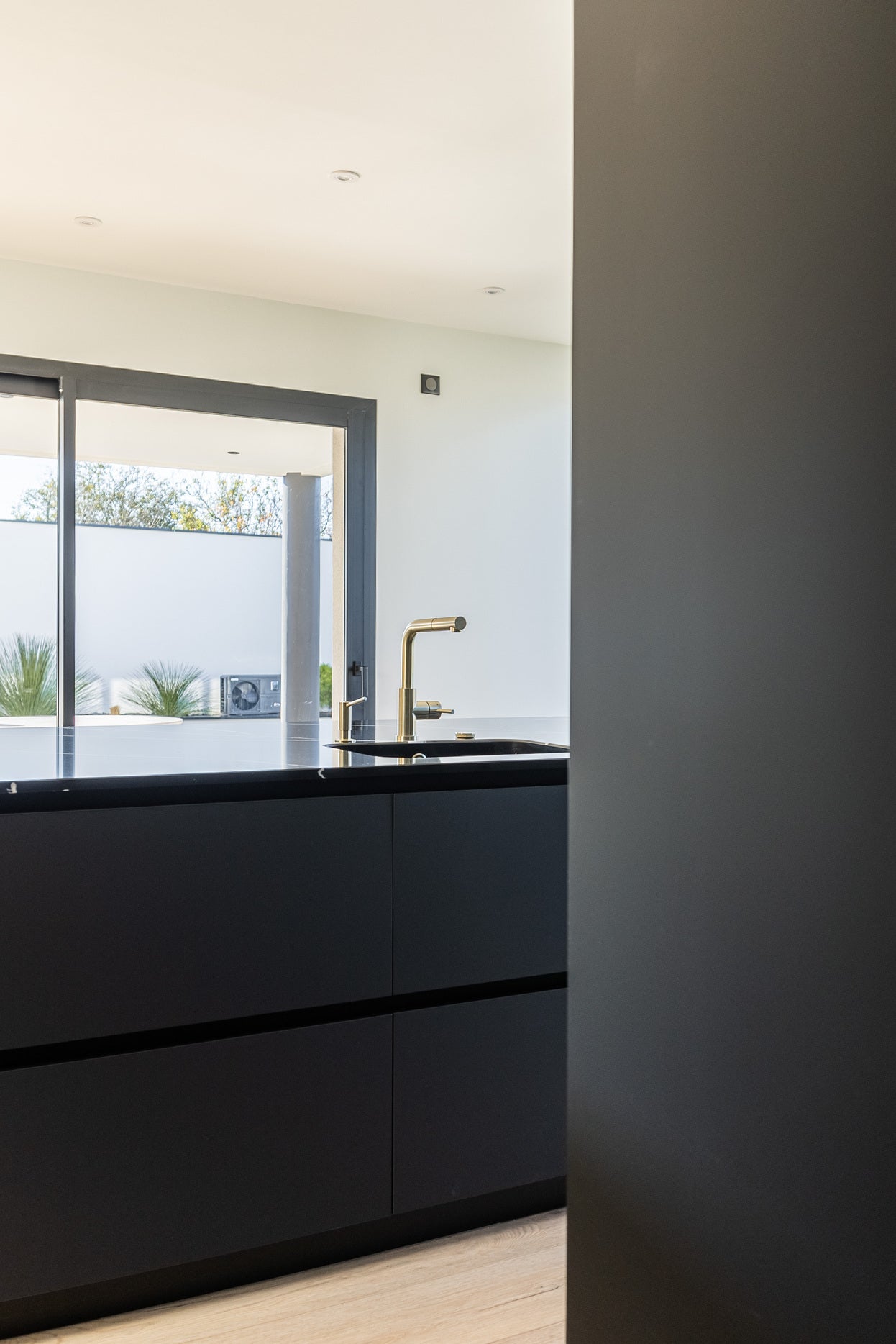 Nous avons été sollicités pour concevoir l’ensemble des agencements intérieurs de cette demeure : buanderie, cellier, sanitaires, chambres, salle de jeux… et surtout la cuisine, véritable pièce maîtresse de la maison. Son implantation a été pensée comme un cœur vivant, fluide et fonctionnel, avec une porte dérobée menant discrètement vers l’arrière-cuisine.